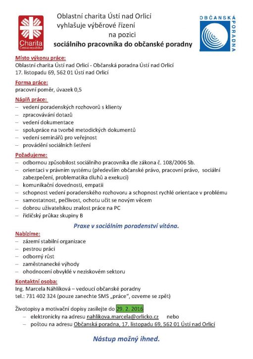 Občanská poradna Ústí nad Orlicí hledá sociálního pracovníka. Prodloužena lhůta (do 29.2.2015) pro dodání životopisu a motivačního dopisu! e-mail: nahlikova.marcela@orlicko.czweb: Podobné články: Vedoucí sociální pracovník (Ústí nad Orlicí) Sociální pracovník (Lanškroun/Ústí nad Orlicí) Sociální pracovník – vedoucí služby NZDM (Ústí nad Orlicí) Peer konzultant/ka (Ústí nad Orlicí) Osobní asistent/ka (Ústí nad Orlicí a Podlesí-Němčí) Sociální pracovník/pracovnice (Ústí nad Labem) 2016-01-29