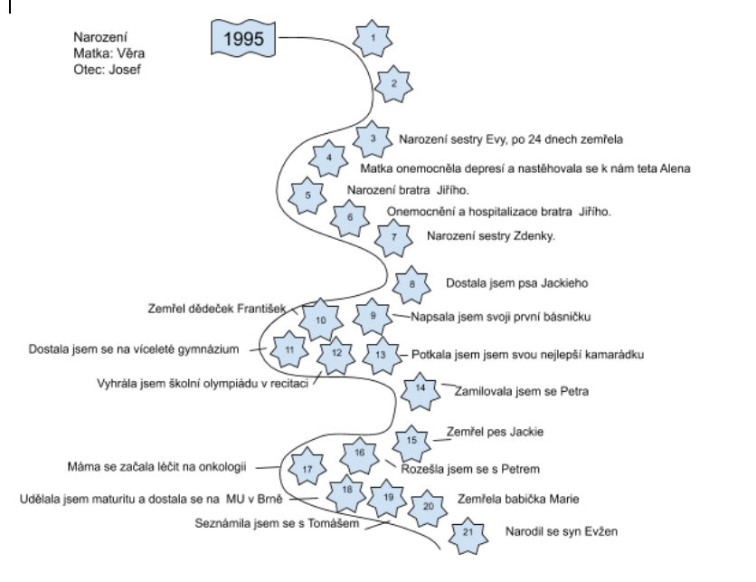 Mapy životní trajektorie lze vypracovávat jak horizontálně, tak vertikálně. Tvorba mapy životní trajektorie začíná informací o narození. Následují informace o dalších subjektivně důležitých událostech života, které klient považuje za formativní (viz obrázek 4). Zachycené události může klient doprovodit dalšími informacemi. Přínosné jsou zvláště informace o emocích, které v něm událost vyvolala. Takový pohled přispívá ke komplexnějšímu porozumění těchto formativních událostí a životních zlomů. Bez emocionální dimenze je někdy jen velmi obtížné porozumět tomu, proč je ta která událost v životě klienta tak významná, že vyvolala zásadní obrat (Howe and Hinings 1995).