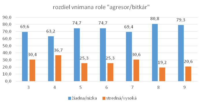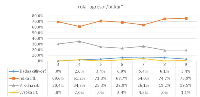 V treťom ročníku až 69,6 % žiakov je nízko citlivých na rolu agresora, čo významne potvrdzuje aj hodnota 0 u žiadnej a vysokej citlivosti. 30,4 % žiakov má strednú citlivosť na rolu agresora. Vo štvrtom ročníku nízka citlivosť mierne klesá na úroveň 60 %, jemne stúpa stredná úroveň a minimálne (na 2 %) aj žiadna a vysoká úroveň citlivosti.