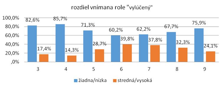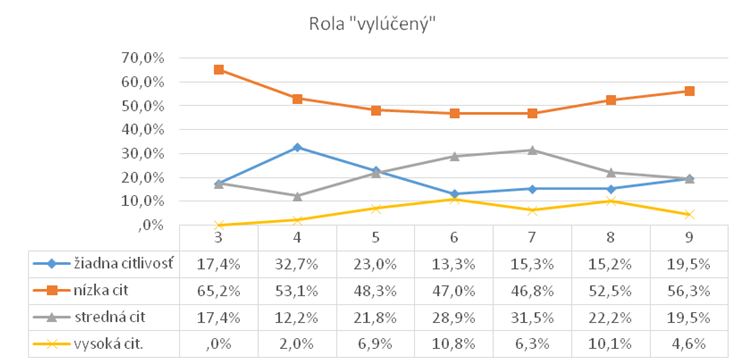 Ďalšou rolou, ktorú budeme interpretovať, je rola vylúčený. Táto rola oproti ostatným prináša zaujímavé a výraznejšie výsledky v kategóriách žiadna a nízka citlivosť na rolu v porovnaní s ostatnými rolami. V treťom ročníku základnej školy nie je vykázaná žiadna citlivosť na rolu u 17,4 % detí. Nízka citlivosť na rolu vylúčený je v tomto ročníku najvyššia a dosahuje hodnotu 65,2 %. Stredná citlivosť je identifikovaná u 17,4 % detí a vysoká citlivosť ako v jedinom ročníku pri tejto role vykazuje nulovú hodnotu. Vo štvrtom ročníku je žiadna citlivosť tiež pomerne vysoká, keď po treťom ročníku dosahuje druhú najvyššiu hodnotu oproti ostatným ročníkom, a to 32,7 %. Nízka citlivosť na rolu sa objavuje u 53,1 % detí, stredná citlivosť dosahuje 12,2 % a vysoká citlivosť je na úrovni 2 %, čo je oproti ostatným ročníkom druhá najnižšia hodnota. V piatom ročníku základnej školy dosahuje žiadna citlivosť na rolu 23 %, nízka citlivosť 48,3 %, stredná citlivosť je vykázaná u necelých 22 % detí a vysoká citlivosť je zaznamenaná u 6,9 % detí piateho ročníka základnej školy. V šiestom ročníku vykazuje žiadnu citlivosť 13,3 % a nízku citlivosť 47 % detí (čo je v oboch prípadoch spolu so siedmym ročníkom najnižšia hodnota v týchto kategóriách citlivosti v porovnaní s inými ročníkmi). Najvyššia (spolu so siedmym ročníkom) oproti iným ročníkom je stredná citlivosť, keď dosahuje úroveň takmer 30 % a vysoká citlivosť dosahuje hodnotu 10,8 %. V siedmom ročníku základnej školy je identifikovaných 15,3 % detí, ktoré majú veľmi nízku (žiadnu) citlivosť, a takmer 47 % detí, ktoré majú nízku citlivosť na rolu vylúčený. So strednou citlivosťou na predmetnú rolu reaguje 31,5 % detí a vysoká citlivosť dosahuje hodnotu 6,3 %, čo sú paralelne so šiestym ročníkom najvyššie hodnoty v týchto kategóriách oproti ostatným sledovaným ročníkom. V ôsmom ročníku sa žiadna citlivosť na rolu prejavuje u 15,2 % detí, nízka citlivosť u 52,5 %, stredná u 38,4 % a vysoká u 4,6 % detí. V deviatom ročníku dosahuje žiadna citlivosť na rolu 19,5 %, nízka citlivosť dosahuje až 56,3 %, stredná citlivosť dosahuje hodnotu 19,5 % a úroveň vysokej citlivosti sa objavuje u 4,6 % detí deviateho ročníka.