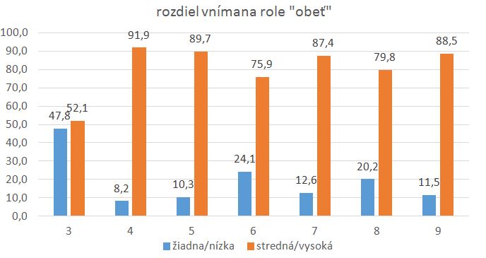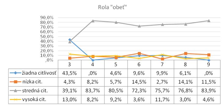 Ako vidíme z nasledujúceho grafu, najviac rozpačití sú z vnímania role obete najmä tretiaci. Takmer rovnako majú percentuálne zastúpenie nulovej alebo veľmi nízkej úrovne a strednej a vysokej úrovne citlivosti na danú rolu. Citlivosť sa začína prudko diferencovať v nasledujúcom, štvrtom ročníku v prospech zvyšovania citlivosti, kedy dosahuje aj najvyššiu citlivosť. Potom veľmi mierne opadáva, aby v šiestom ročníku mala tendenciu sa trocha zvyšovať necitlivosť. V deviatom ročníku sa rozdiel medzi necitlivosťou a citlivosťou opäť zvyšuje.