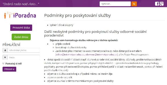 PSPr v iPoradně realizujeme poskytováním registrované služby odborného sociálního poradenství pro OZP a NFP. Tu obecněji charakterizujeme (srv. dle zákona o sociálních službách č. 108/2006 Sb.) jako komplex služeb určených osobám, které mohou být znevýhodněny zdravotně i sociálně, jejichž primární nemoc, postižení, dysfunkce má dlouhodobou nebo trvalou povahu, a které jsou ve svízelné či rizikové situaci, mají narušené osobní i sociální fungování a mohou se nacházet ve stavu životní nepohody až sociální exkluze. V této souvislosti může poradenská intervence, včetně její online i-formy, být: